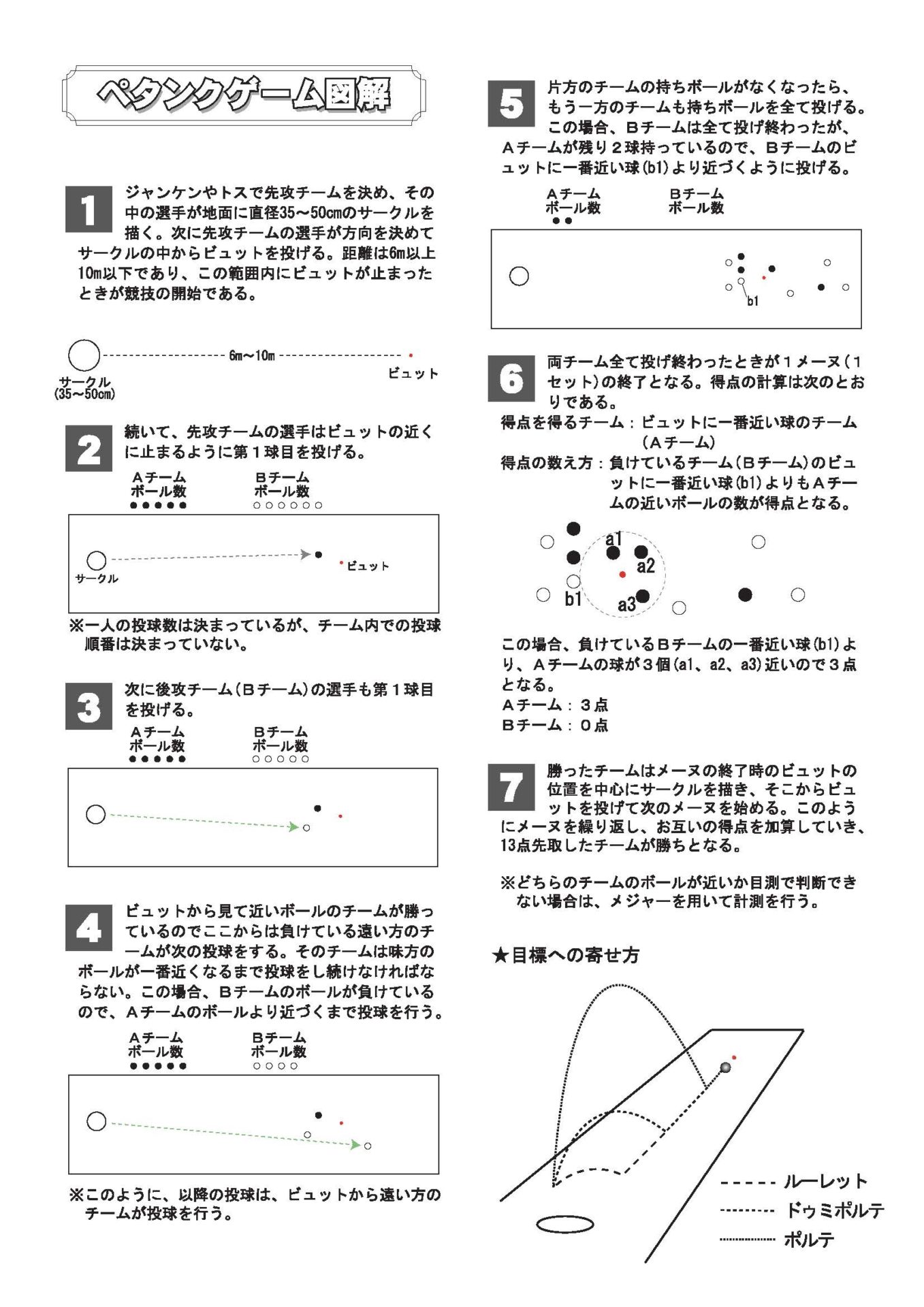 ペタンクは簡単に言うと,目標球(ビュット)に,ブール(重いボール)を投げ合って,相手より近づけることで得点を競うものです。相手のブールに当ててはじき飛ばしたり,味方のブールに押すように当てたりして,ビュットに近づけることもできます。ビュットに当てて味方のブールに近づけることもできます。ゲームは,トリプルス(1チーム3人),ダブルス(1チーム2人),シングルス(1人対1人)の形式で行われます。トリプルスでは,各自が2個のブールを,ダブルス・シングルスでは,各自が3個のブールを投げます。